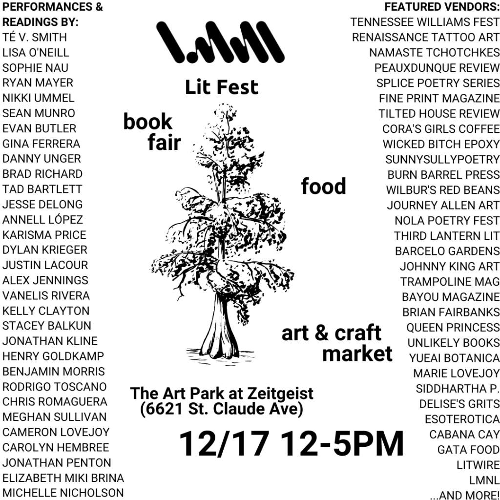 For anyone in the New Orleans area, this weekend offers one of the best new literary festivals in town, hosted by the folks at lmnl — all afternoon on Saturday, December 17, writers, writing groups, publications, and more will gather to ring the holidays in in style. I’ll be reading around 3pm; more information at the event page on FB. Don’t miss it — nearly every single writer in town will be there!